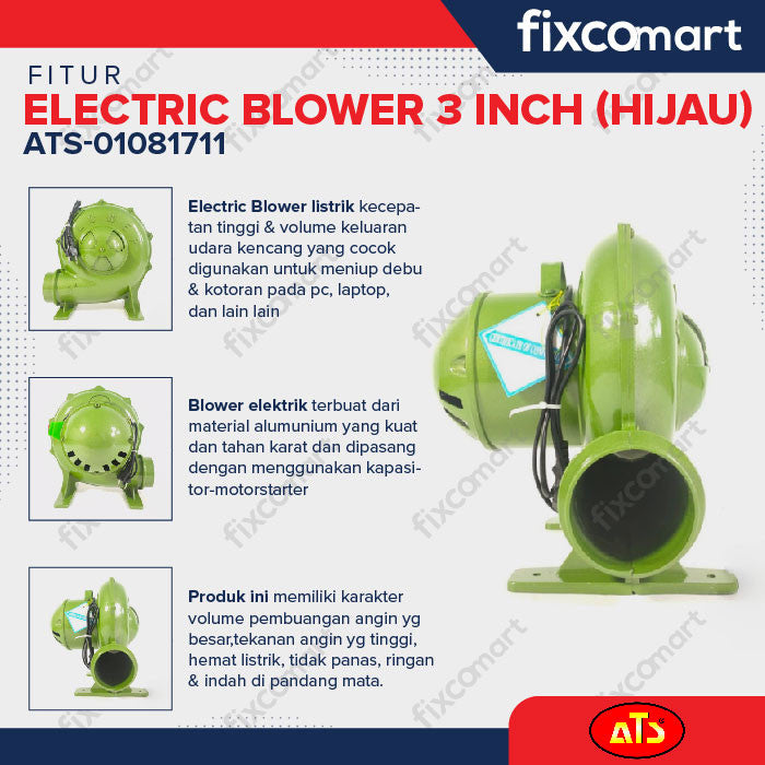 Electric Blower ATS 3" Keong adalah blower serbaguna yang cocok untuk kebutuhan industri, bengkel, maupun rumah tangga. Didesain dengan bentuk keong dan warna hijau yang khas, blower ini menawarkan performa tinggi dengan konsumsi daya yang efisien.