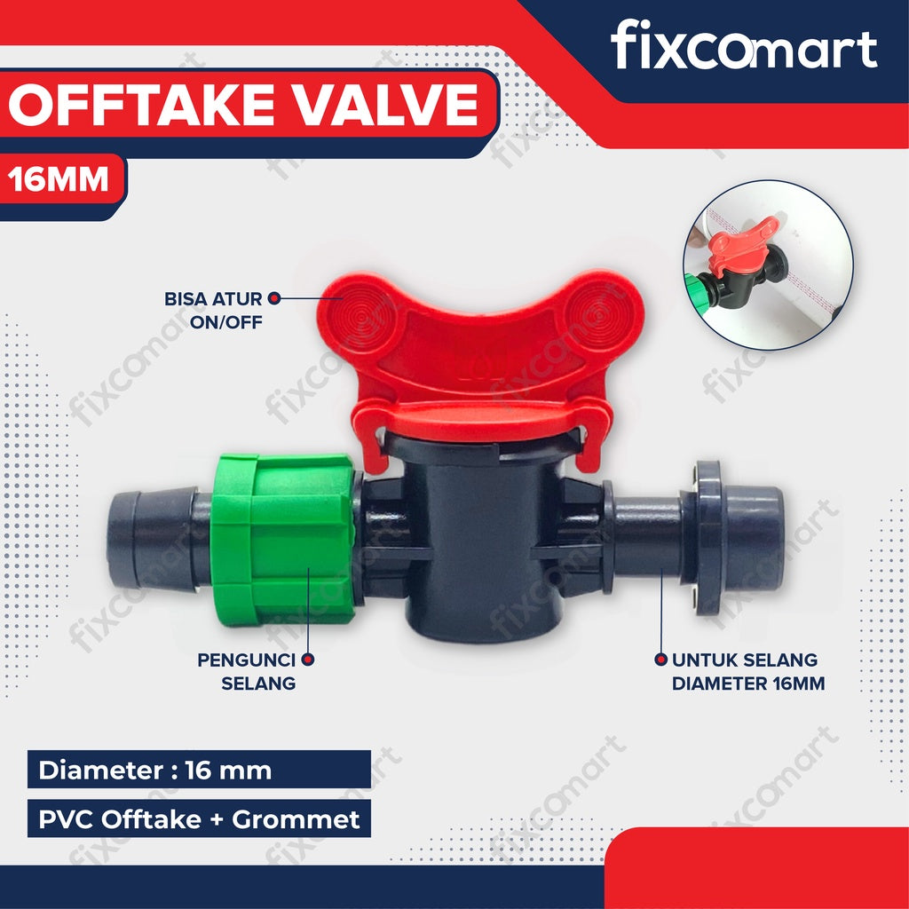 Menghubungkan drip tape ke pipa PVC ataupun Pipa LDPE yang dilubangi bagian sampingnya. Konektor ini dilengkapi dengan valve/ keran untuk mengatur aliran sesuai kebutuhan