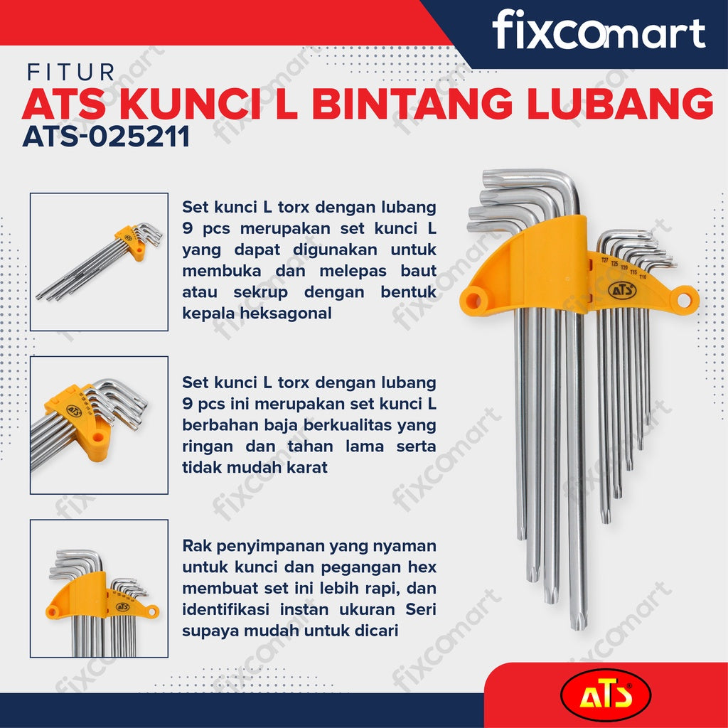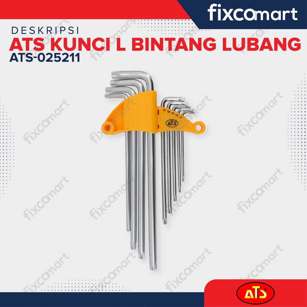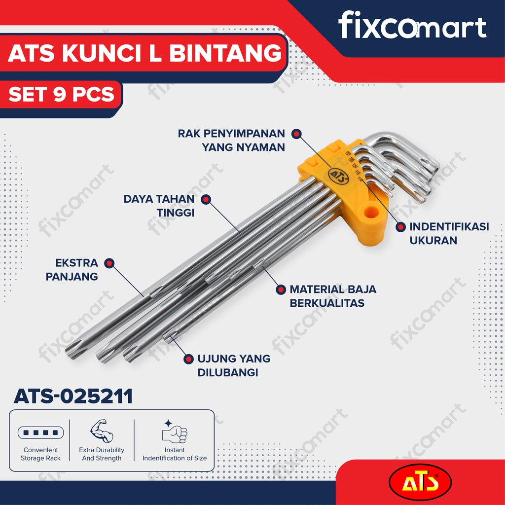 ATS Kunci L Bintang Set 9 Pcs T10 - T50 Dengan Lubang Panjang, sangat berguna untuk pekerjaan pertukangan, perbengkelan, industri ringan bahkan rumah tangga. Harga Terjangkau, Tahan Lama. Perkakas yang wajib Anda miliki di tool box penyimpanan Anda.