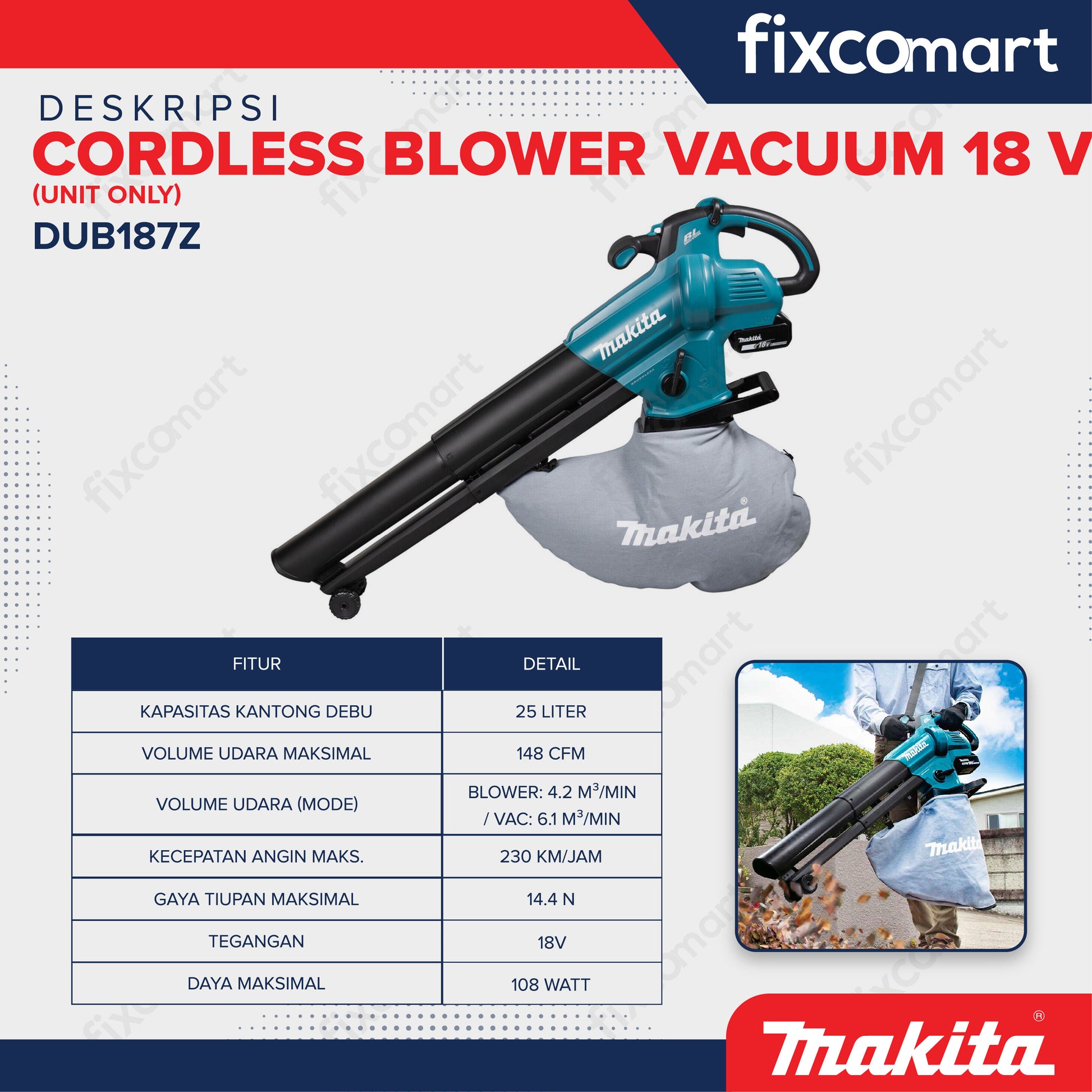Makita DUB187Z adalah alat peniup (blower) sekaligus penyedot debu (vacuum) bertenaga baterai 18V dari seri LXT Makita. Dengan desain yang ringkas dan tanpa kabel, alat ini sangat cocok untuk membersihkan dedaunan, debu, hingga serpihan kayu di area kerja atau rumah. Cocok untuk profesional maupun pemakaian rumahan.