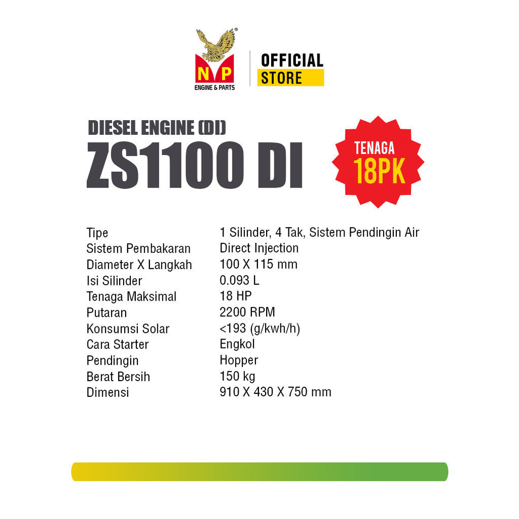 Mesin Diesel ZS1100 dari NP adalah mesin penggerak serbaguna yang dirancang untuk memberikan tenaga besar dengan efisiensi tinggi. Menggunakan sistem pembakaran direct injection, mesin ini memastikan pembakaran bahan bakar yang lebih sempurna dan efisien. Dengan desain satu silinder dan diameter x langkah 100 x 115mm, mesin ini memiliki kapasitas silinder 0,903 liter, menghasilkan tenaga maksimal 18 HP pada 2200 RPM.