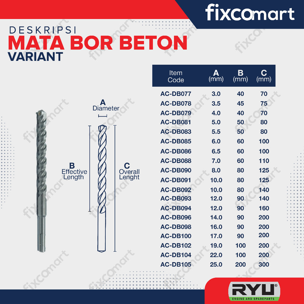 RYU (AC) MASONRY Bits digunakan untuk membuat lubang pada tembok dan beton dengan ukuran 10,0 mm. Pada ujung mata bor terdapat mata pisau. Mata bor ini terbuat dari bahan yang mempunyai karakteristik sangat keras, sebab penggunaan mata bor Masonry Bits ini selain berputar namun juga memukul
