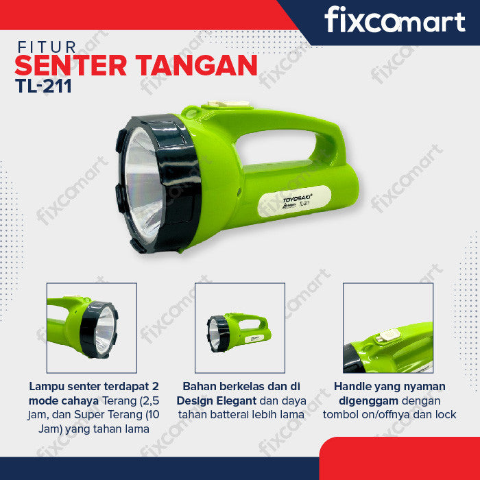 Senter Tangan Toyosaki TL-211 adalah alat penerangan yang dirancang untuk memberikan cahaya yang kuat dan andal dalam berbagai situasi. Dengan desain yang ergonomis dan kokoh, senter ini cocok untuk penggunaan sehari-hari maupun kegiatan luar ruangan seperti berkemah, mendaki, atau dalam kondisi darurat.