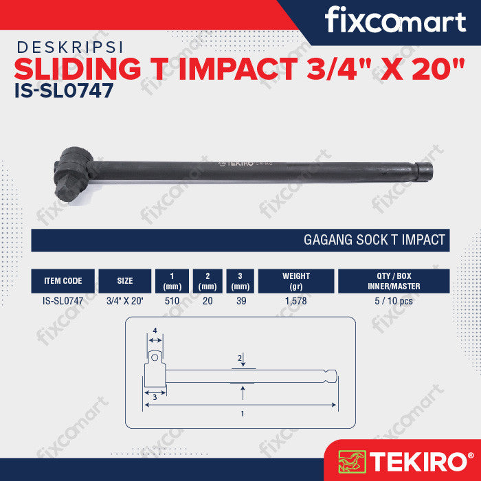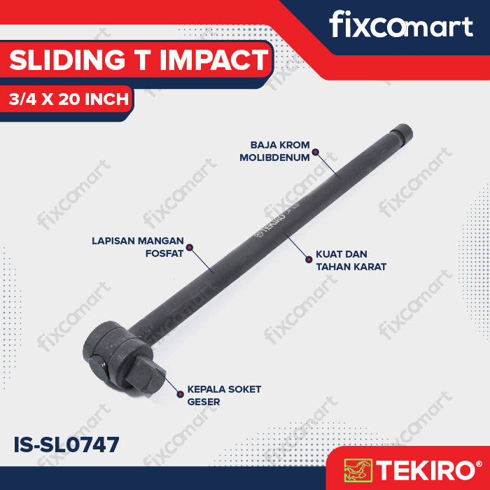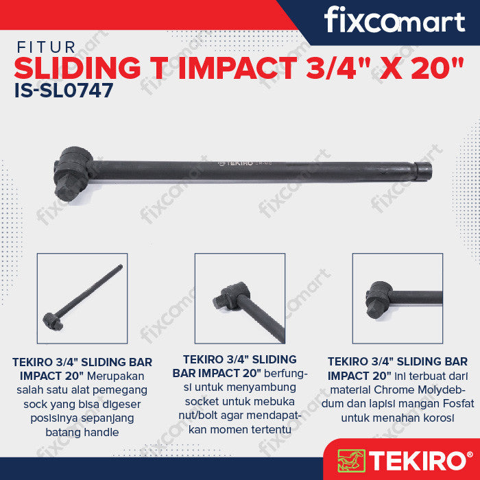 TEKIRO 3/4" SLIDING BAR IMPACT 20" Merupakan salah satu alat pemegang sock yang bisa digeser posisinya sepanjang batang handle. Hal ini menguntungkan apabila digunakan pada area kerja yang sempit. berfungsi untuk menyambung socket untuk mebuka nut/bolt agar mendapatkan momen tertentu