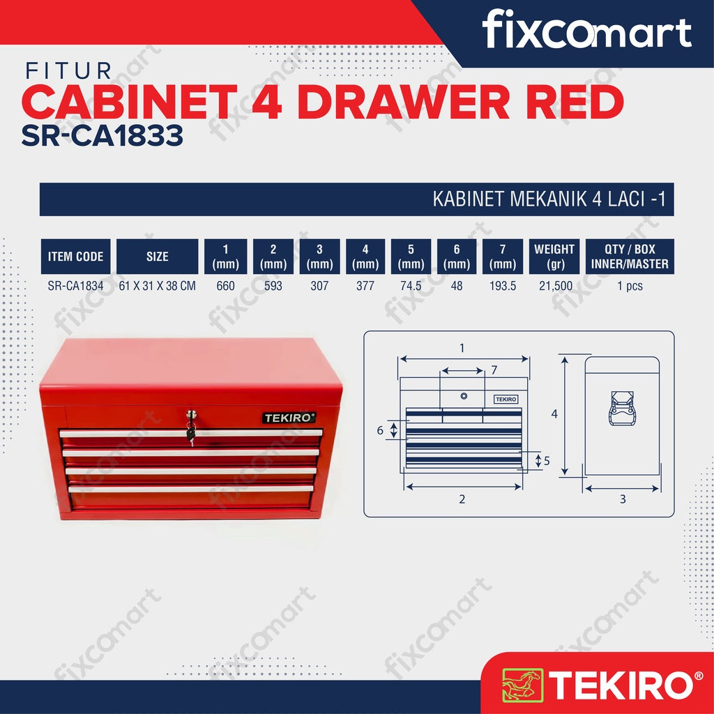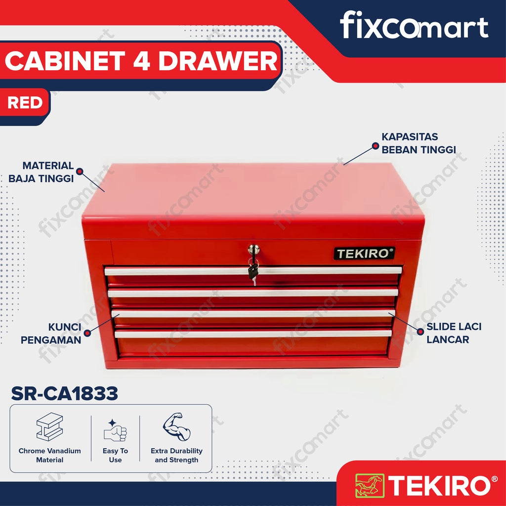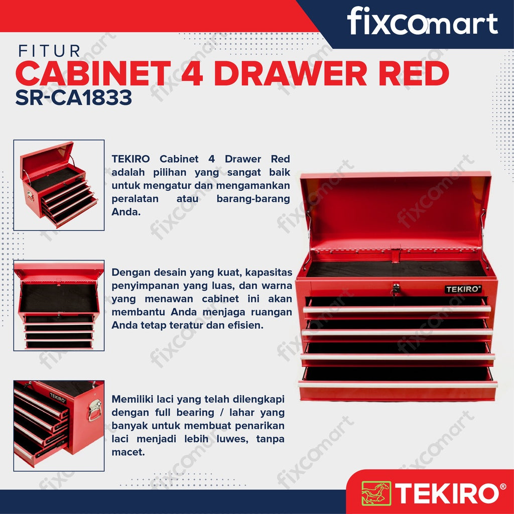 TEKIRO Cabinet 4 Drawer Red Marketplace adalah pilihan yang sangat baik untuk mengatur dan mengamankan peralatan atau barang-barang Anda. Dengan desain yang kuat, kapasitas penyimpanan yang luas, dan warna yang menawan, cabinet ini akan membantu Anda menjaga ruangan Anda tetap teratur dan efisien.