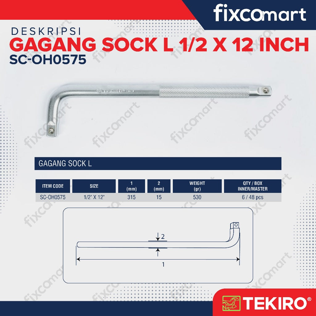 TEKIRO Gagang Sock L Offset Handle merupakan kunci sock atau yang dikenal juga dengan nama kunci socket merupakan kunci yang memiliki bentuk silinder dan terbuat dari chrome vanadium yang dilapisi dengan nikel. Bentuk kunci ini unik, karena pada satu ujung berbentuk segi 4 sementara pada ujung lainnya memiliki bentuk heksagonal. Fungsi kunci sock pada dasarnya adalah sama seperti halnya kunci-kunci lainnya, yaitu untuk melepas atau memasang kepala baut dan mur dengan momen kekencangan tertentu. L handle ini dapat bergerak bebas sehingga memungkinkan untuk dapat digunakan pada posisi yang rumit.
