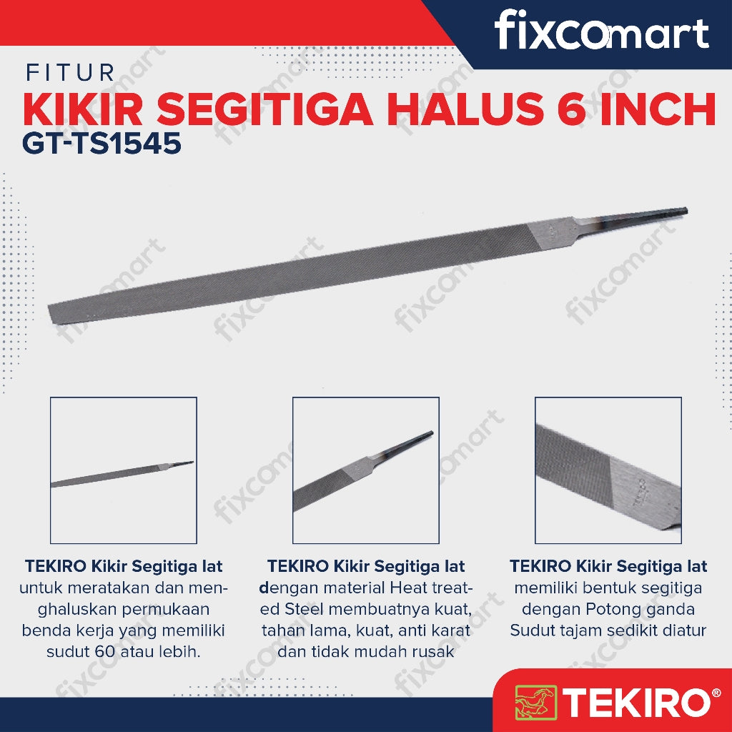 TEKIRO Kikir Segitiga. Merupakan alat untuk meratakan dan menghaluskan permukaan benda kerja yang memiliki sudut dengan sudut 60 atau lebih. Dengan material Heat treated Steel membuatnya kuat dan tidak mudah rusak.