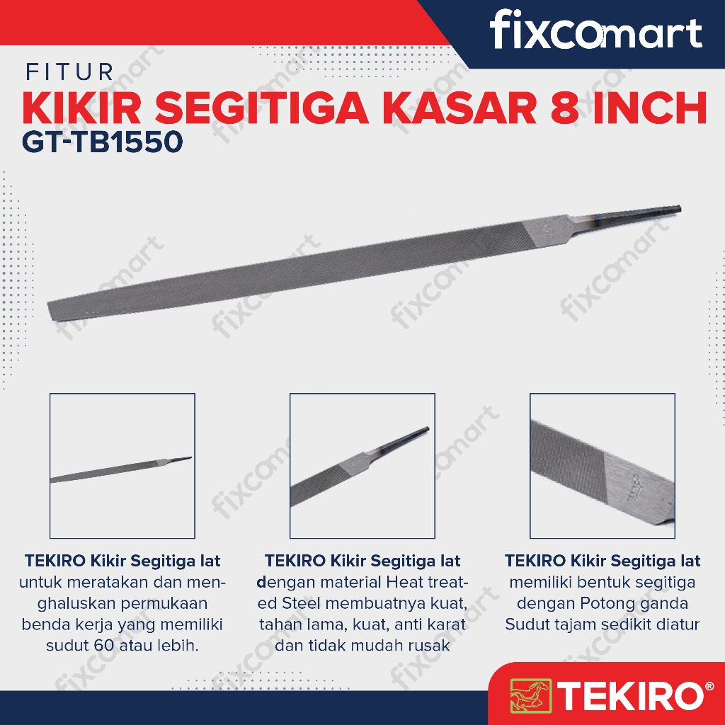 TEKIRO Kikir Segitiga. Merupakan alat untuk meratakan dan menghaluskan permukaan benda kerja yang memiliki sudut dengan sudut 60 atau lebih. Dengan material Heat treated Steel membuatnya kuat dan tidak mudah rusak.