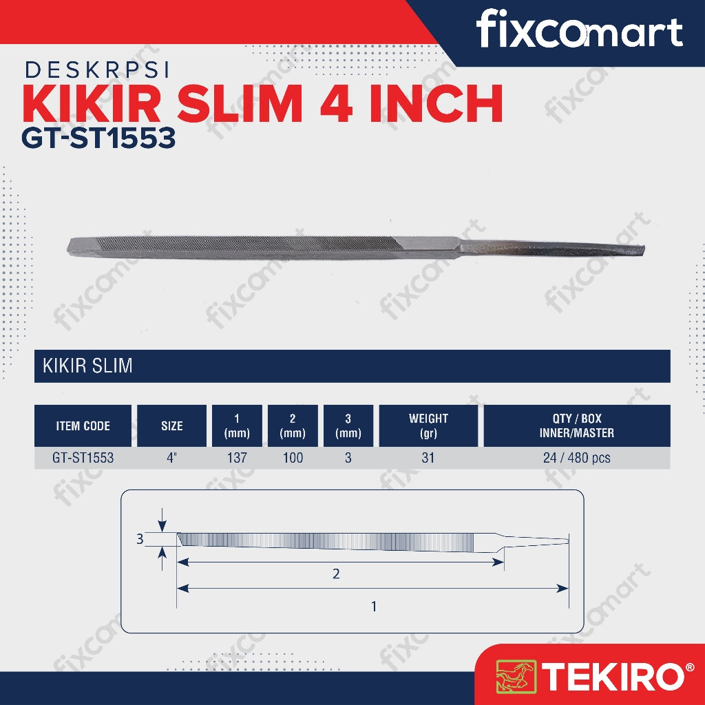 TEKIRO Kikir Slim. Merupakan alat untuk meratakan dan menghaluskan permukaan benda kerja dengan celah tipis. Dengan material Heat treated Steel membuatnya kuat dan tidak mudah rusak.