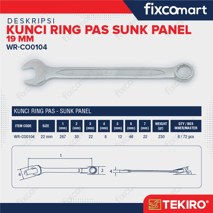 - Kunci Ring Pas - Model Sunk Panel - Ukuran 19 mm - Merk Tekiro