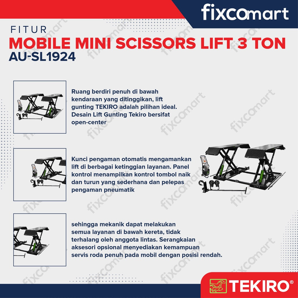 Saat Anda perlu menghemat ruang tetapi menginginkan ruang berdiri penuh di bawah kendaraan yang ditinggikan, lift gunting TEKIRO adalah pilihan ideal. Desain Lift Gunting Tekiro bersifat open-center, sehingga mekanik dapat melakukan semua layanan di bawah kereta, tidak terhalang oleh anggota lintas. Serangkaian aksesori opsional menyediakan kemampuan servis roda penuh pada mobil dengan posisi rendah.