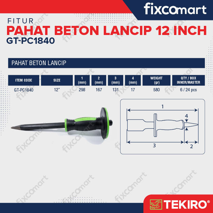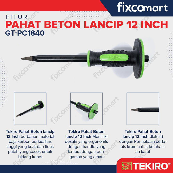 Tekiro Pahat Beton lancip 12 Inch berbahan material baja karbon berkualitas tinggi yang kuat dan cocok untuk bidang keras. Tekiro Pahat Beton lancip 12 Inch Memiliki desain yang ergonomis dengan handle yang lembut dengan pengaman yang aman. Pahat Bobok ini dipergunakan untuk pekerjaan membobok beton secara fokus pada satu titik terarah sesuai target bobokan / pahatan, terbuat dari Carbon STEEL / BAJA Keras. Alat pahat ini sudah dilengkapi dengan payung karet pada pegangannya untuk melindungi tangan dari hantaman palu yang secara tidak sengaja mengenai tangan pemakai.