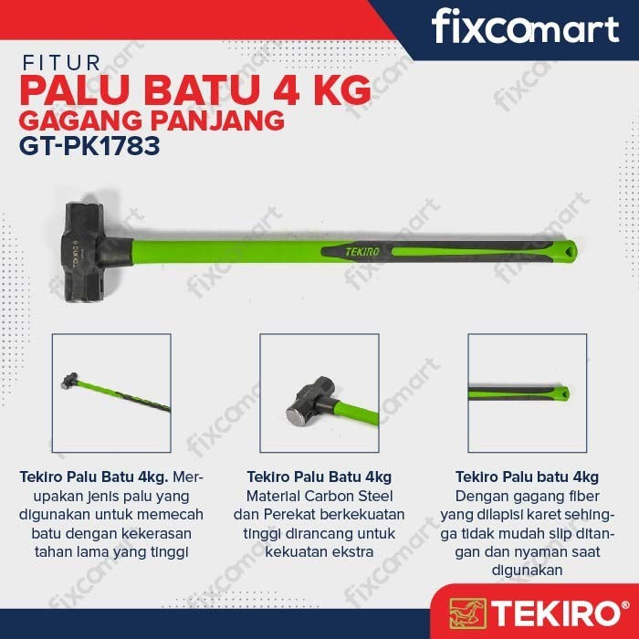 Tekiro Palu Batu 4kg. Merupakan jenis palu yang digunakan untuk memecah batu dengan kekerasan tahan lama yang tinggi,Tekiro Palu Batu 4kg Material Carbon Steel dan Perekat berkekuatan tinggi dirancang untuk kekuatan ekstra,Tekiro Palu batu 4kg memiliki gagang fiber yang dilapisi karet sehingga tidak mudah slip ditangan dan nyaman saat digunakan