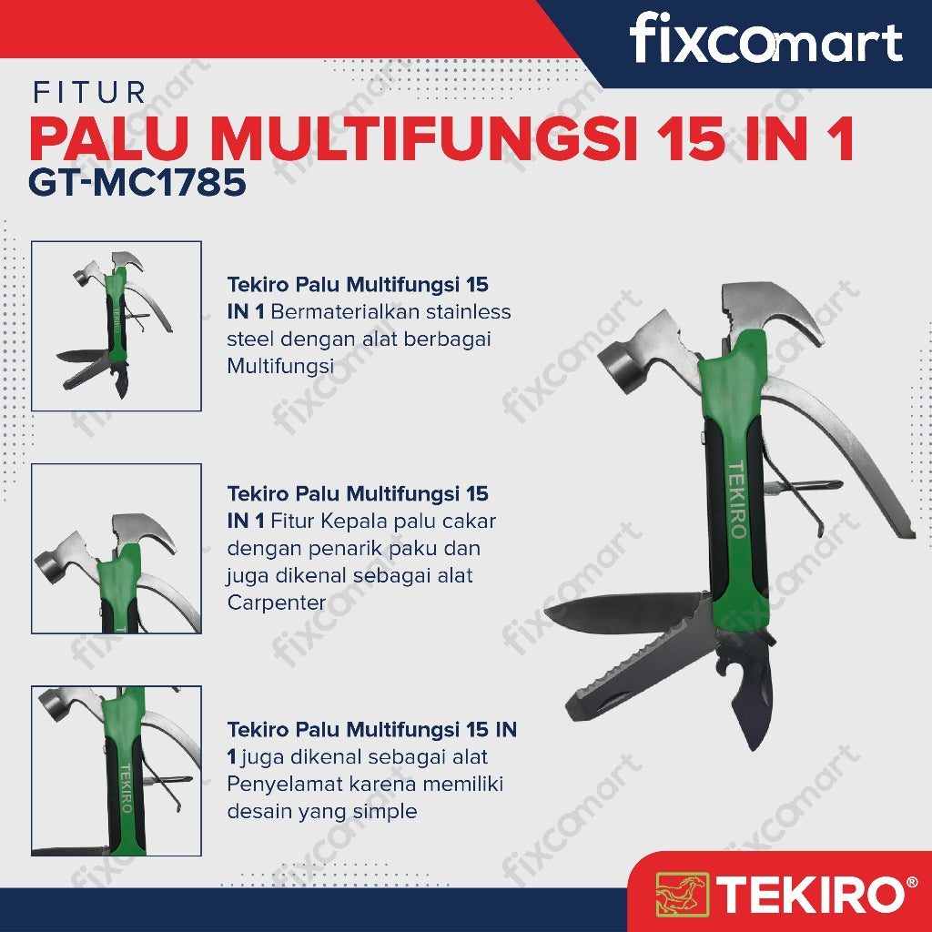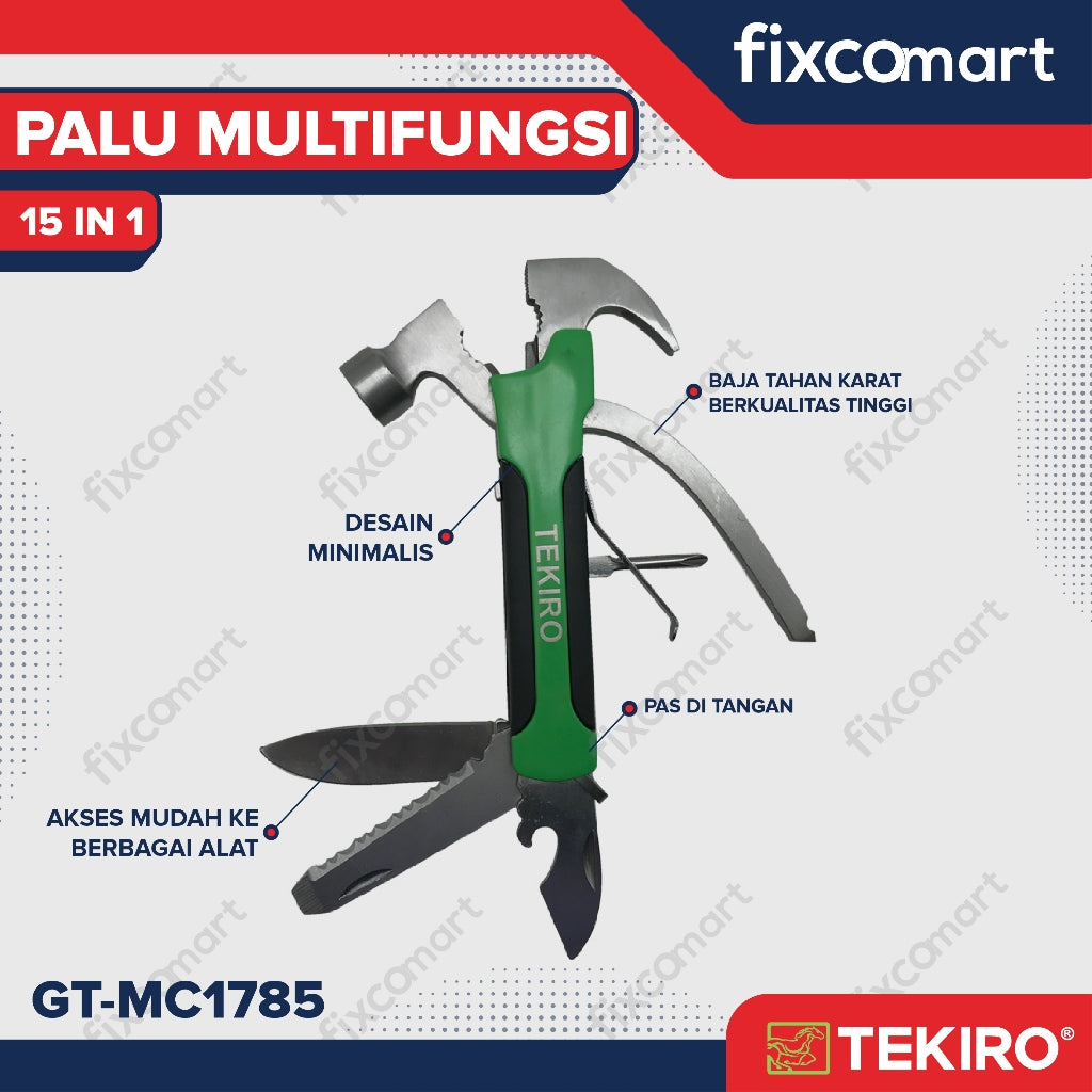 PALU MULTIFUNGSI 15 IN 1 bermaterialkan stainless steel dengan fungsi antara lain : Tang penjepit untuk menjepit benda kerja, Tang Penggigit Utama untuk menjepit benda dengan kuat, Pemotong Kabel, Palu untuk menghancurkan dan melubangi benda, Obeng kecil pembuka sekrup, Obeng pembuka baut, Pisau gerigi tertutup untuk memotong benda bulat, Pisau penusuk untuk melubangi dan merobek, Pembuka botol, Pisau Tajam untuk memotong benda permukaan rata, Pencabut paku, Obeng untuk membuka sekrup kecil plus, Obeng untuk membuka sekrup besar, Kikir untuk menghaluskan potongan, Pisau Gergaji untuk memotong benda