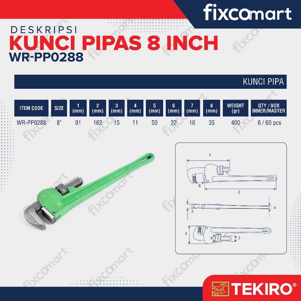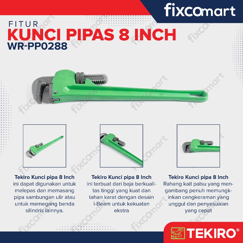 TEKIRO Kunci Pipa merupakan kunci pipa berbahan metal berkualitas, kuat, dan tahan lama dengan ukuran 8 Inch serta memiliki konstruksi hampir sama dengan kunci inggris yaitu mempunyai rahang diam, rahang geser, dan ulir penyetel.