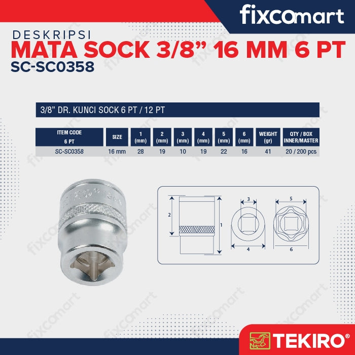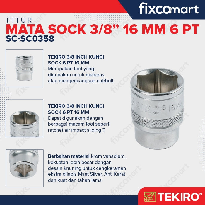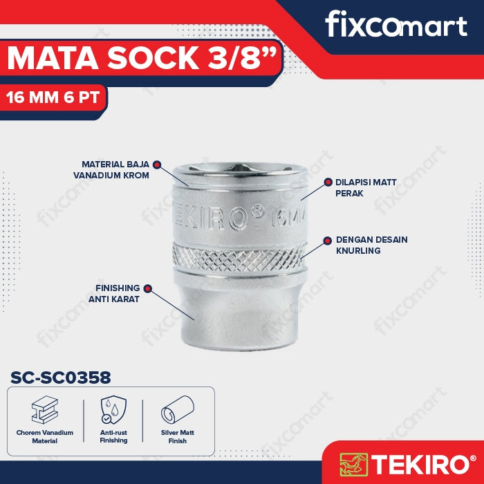 Tekiro Socket 3/8 inch 16 mm 6 PT / Mata Sock 3/8 Inch