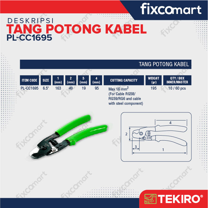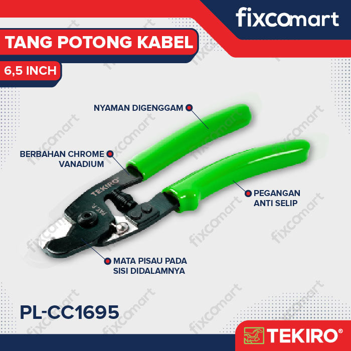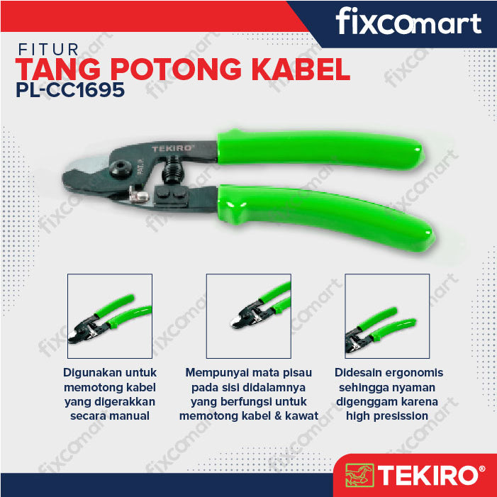 TEKIRO Tang Potong Kabel merupakan tang potong berbahan Chrome Vanadium yang didesain ergonomis sehingga nyaman digenggam karena high presission, tang ini mempunyai mata pisau pada sisi didalamnya yang berfungsi untuk memotong kabel dan kawat.