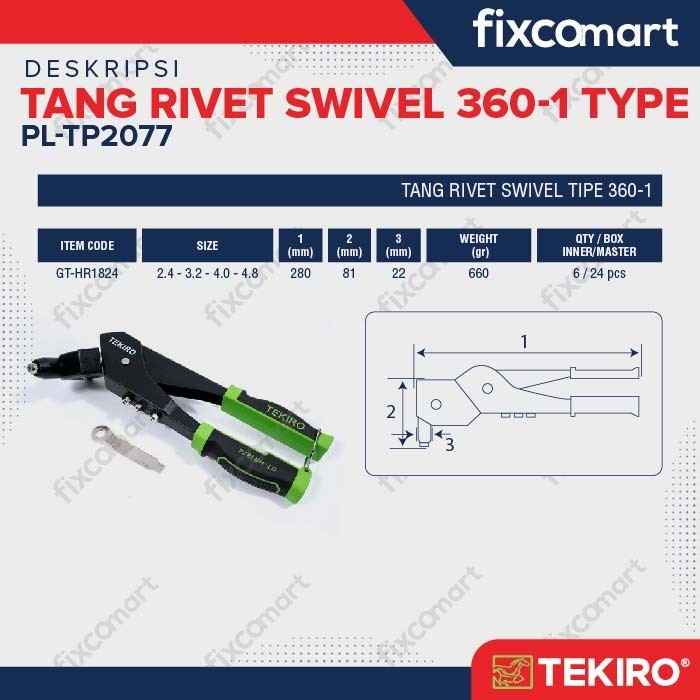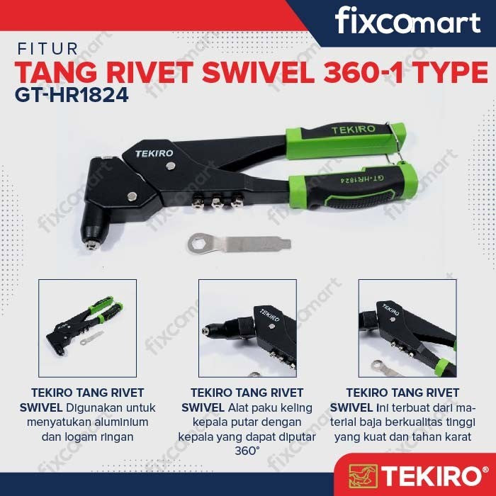 TEKIRO Tang Rivet Swivel 360-1 Type adalah alat tangan berkualitas tinggi yang dirancang khusus untuk keperluan pemasangan rivet pada berbagai jenis bahan. Alat ini memiliki fitur kepala putar 360 derajat yang memungkinkan pengguna untuk menjangkau dan bekerja di area yang sulit dijangkau dengan lebih mudah dan efisien.