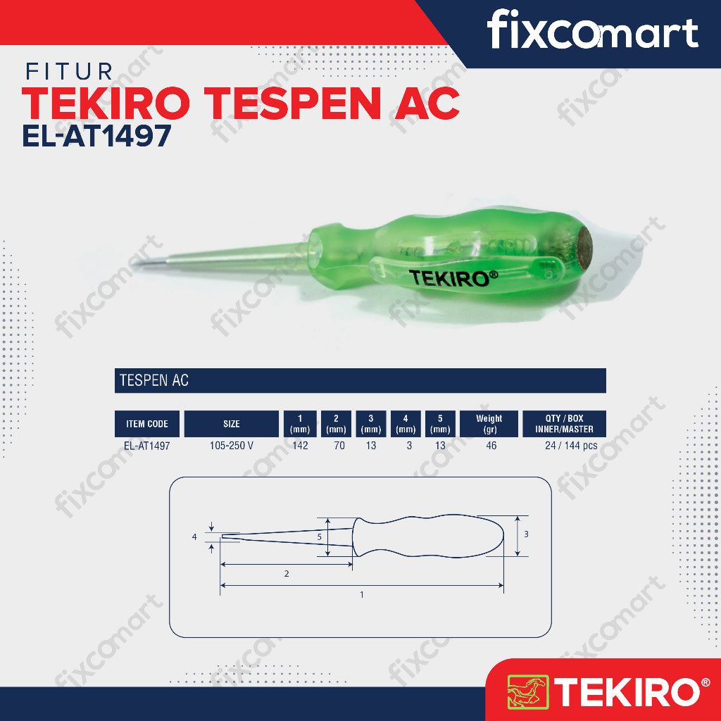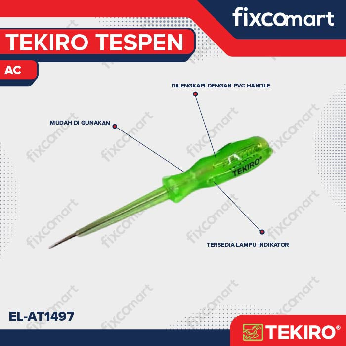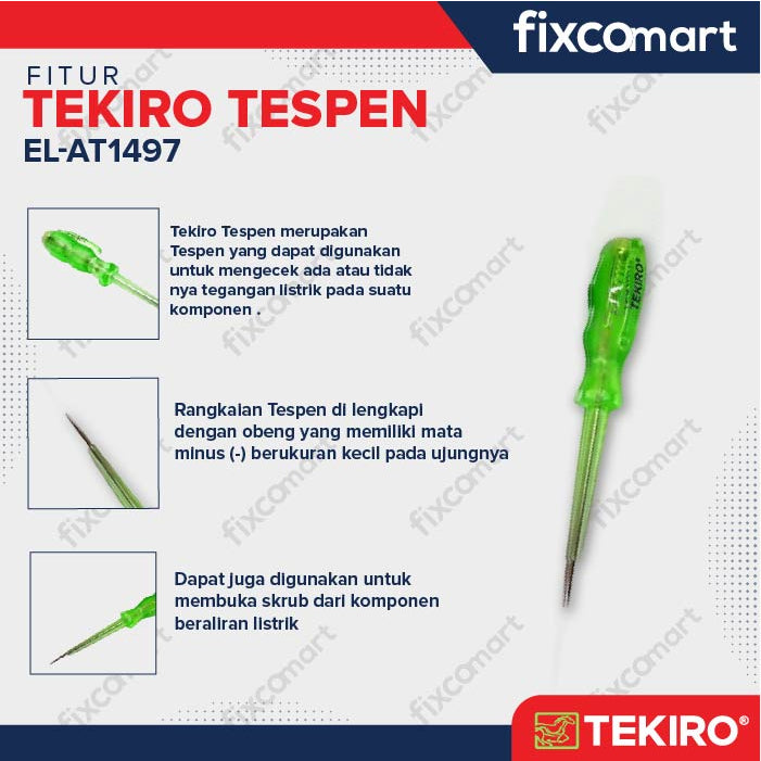 TEKIRO Tespen AC Perkakas Tangan merupakan tespen yang dapat digunakan sebagai alat yang digunakan untuk mengecek atau mengetahui ada tidaknya suatu tegangan listrik. Rangkaian Tespen berbentuk obeng yang mempunyai mata minus (-) berukuran kecil pada bagian ujungnya. Tespen juga memiliki jepitan seperti pulpen sebelumnya dan di dalamnya terdapat led yang mampu menyala sebagai indikator tegangan listrik