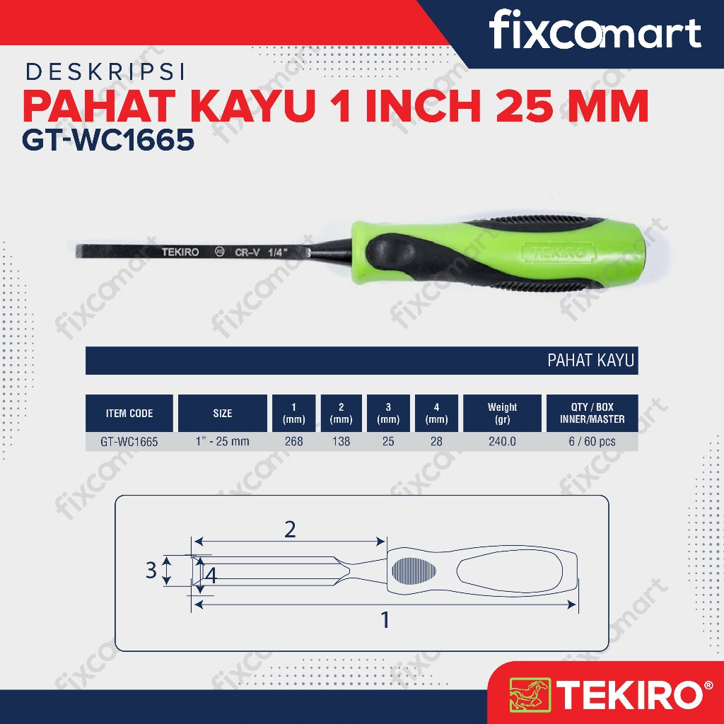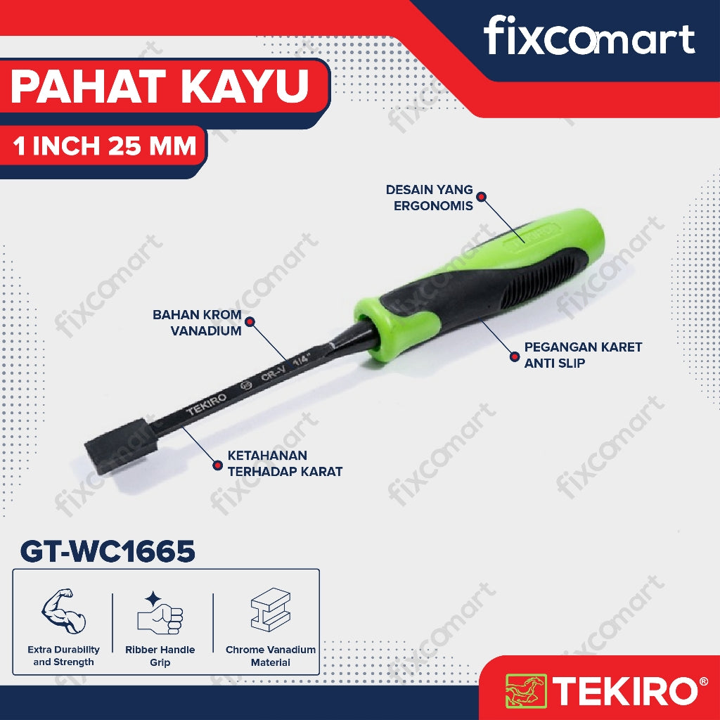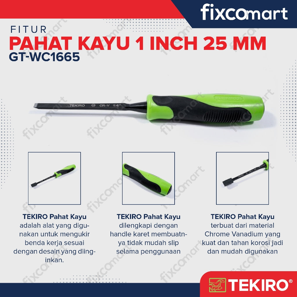 Tekiro Pahat Kayu merupakan alat yang digunakan untuk mengukir atau melubangi benda kerja sesuai dengan desain yang diinginkan. Dengan handle karet membuatnya tidak mudah slip selama penggunaan